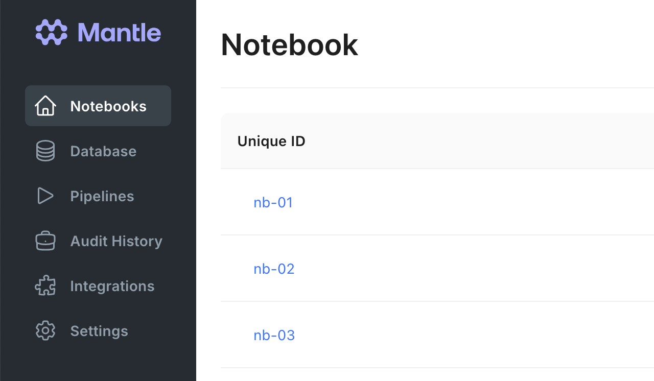 Get started with Mantle Notebooks by navigating to the Notebooks tab within Mantle.