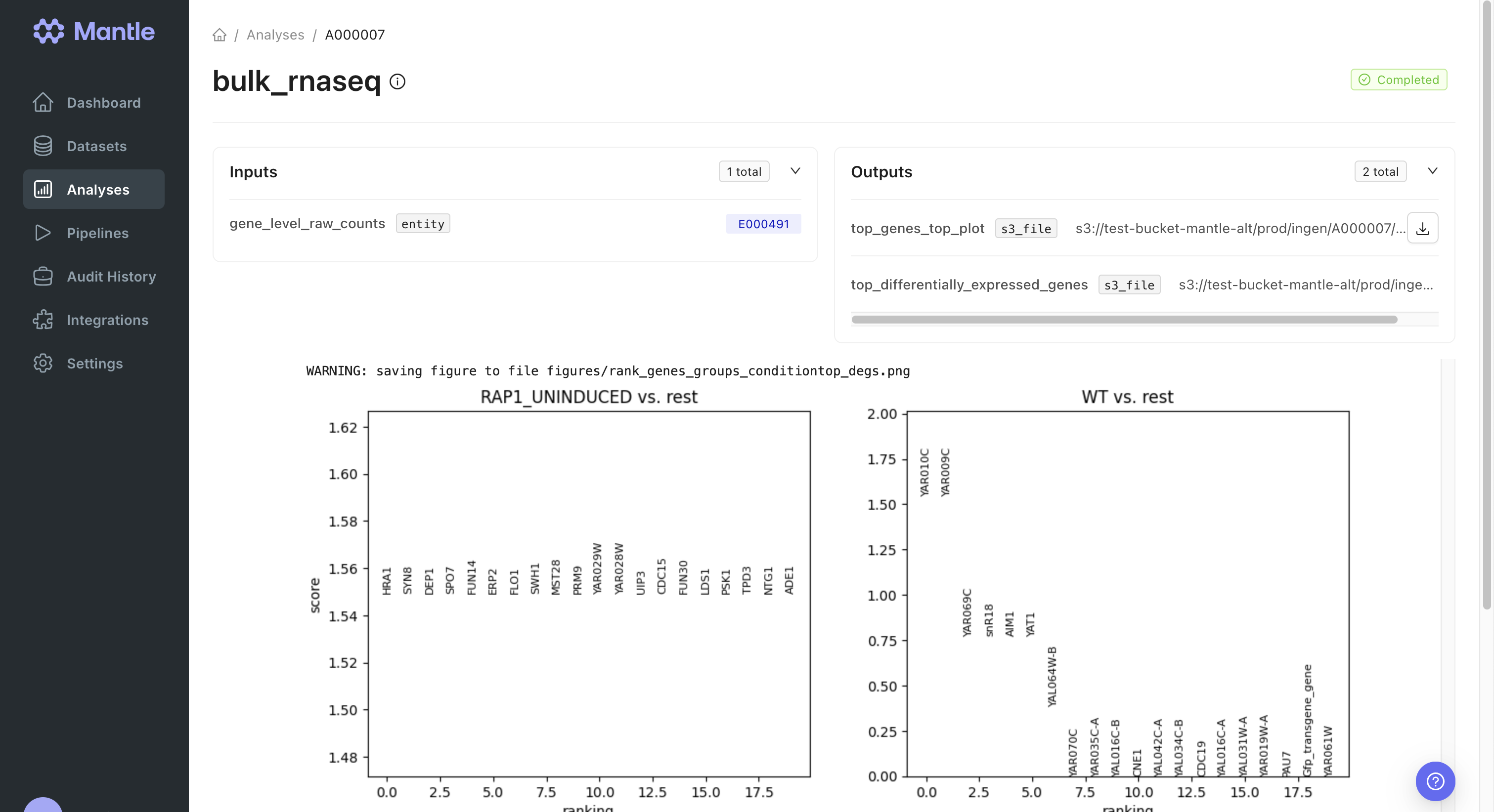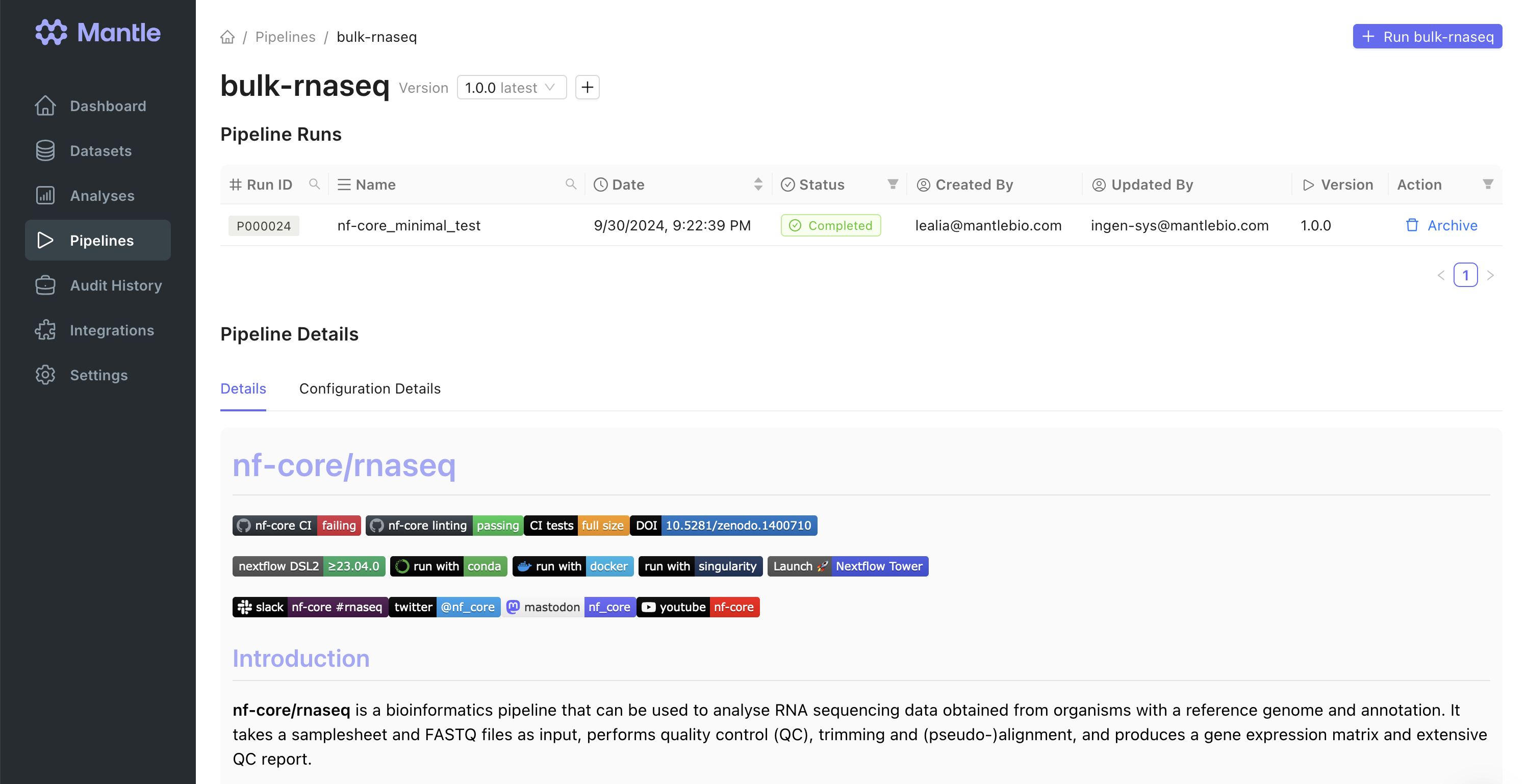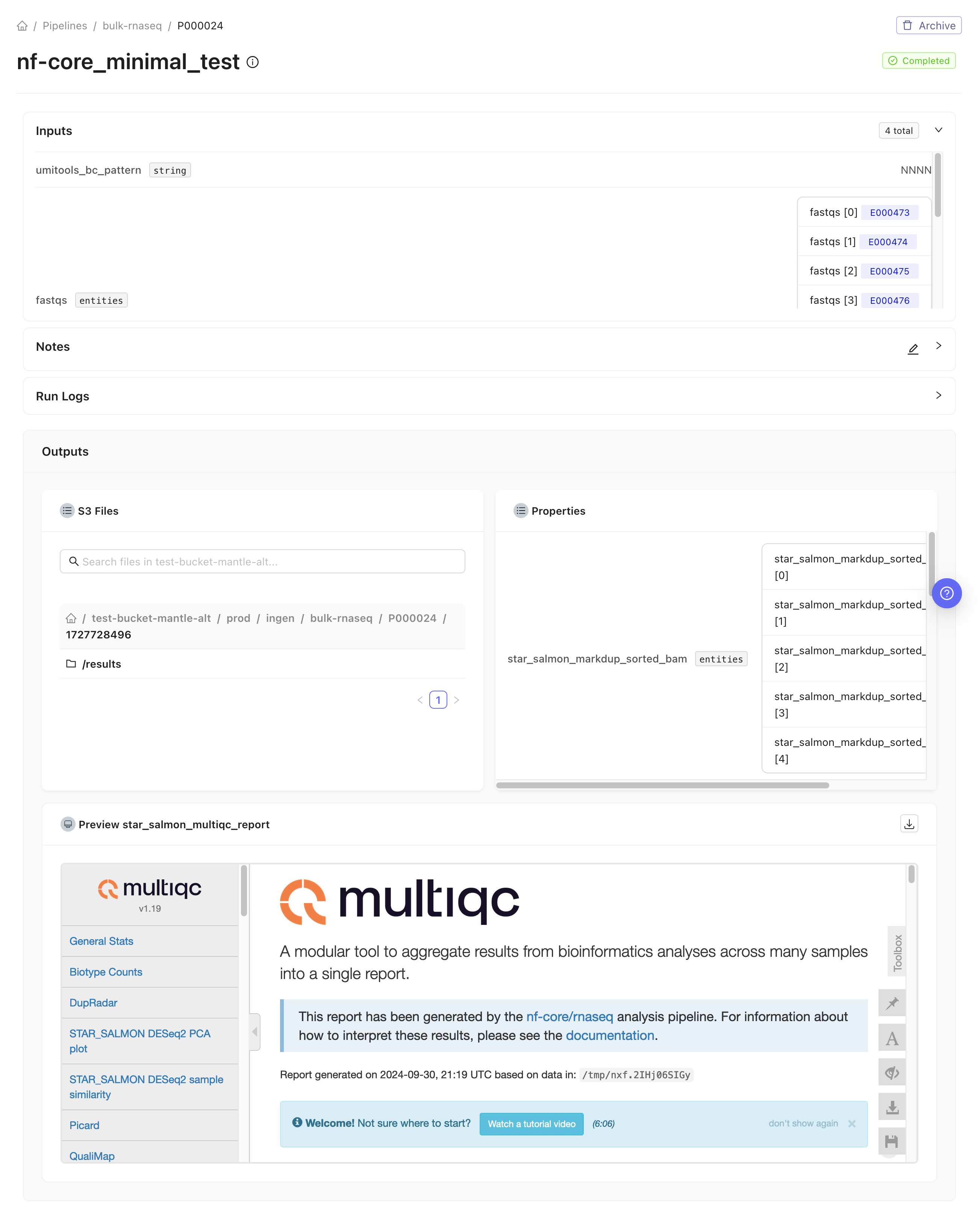 rnaseq_fastq datasets into an input samplesheet. Additionally, we added a process at the end of the workflow to collect some of the files that the pipeline creates into Mantle datasets, and to register the MultiQC report HTML file as an output of the pipeline on Mantle, which allows it to be displayed on the pipeline run page.