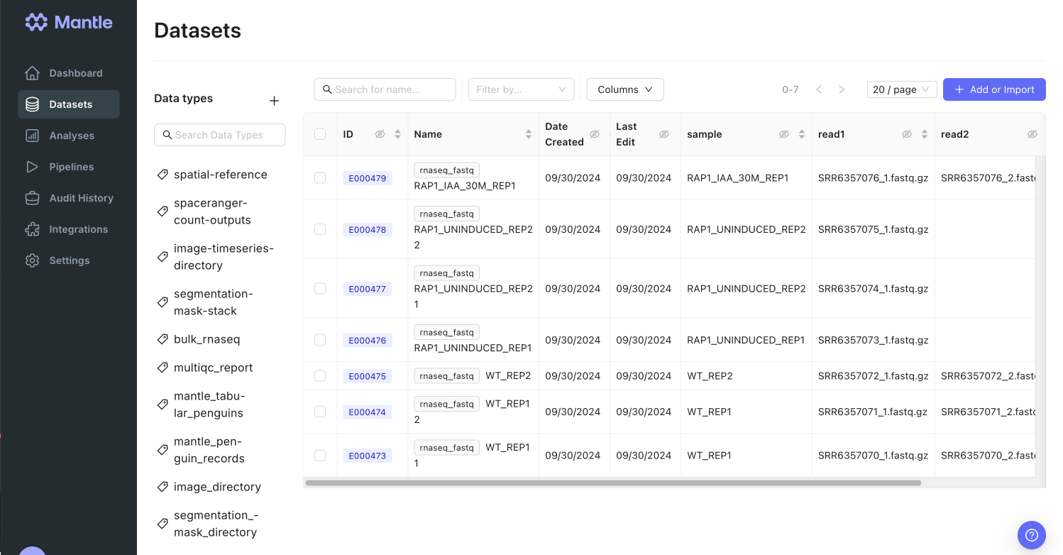 Bulk RNA sequencing (RNAseq) experiments result in raw sequencing reads, typically in FASTQ format. In order to use this data to gain insights into gene expression patterns, identify novel transcripts, etc., it must undergo a series of processing steps – including quality control, read alignment, quantification of gene expression – and then further analysis depending on the aims of the experiment. Mantle can be used for data management, preprocessing, and downstream analysis of bulk RNAseq data. All data, pipelines, and analysis environments in this tutorial are available in your Mantle account.Raw data management